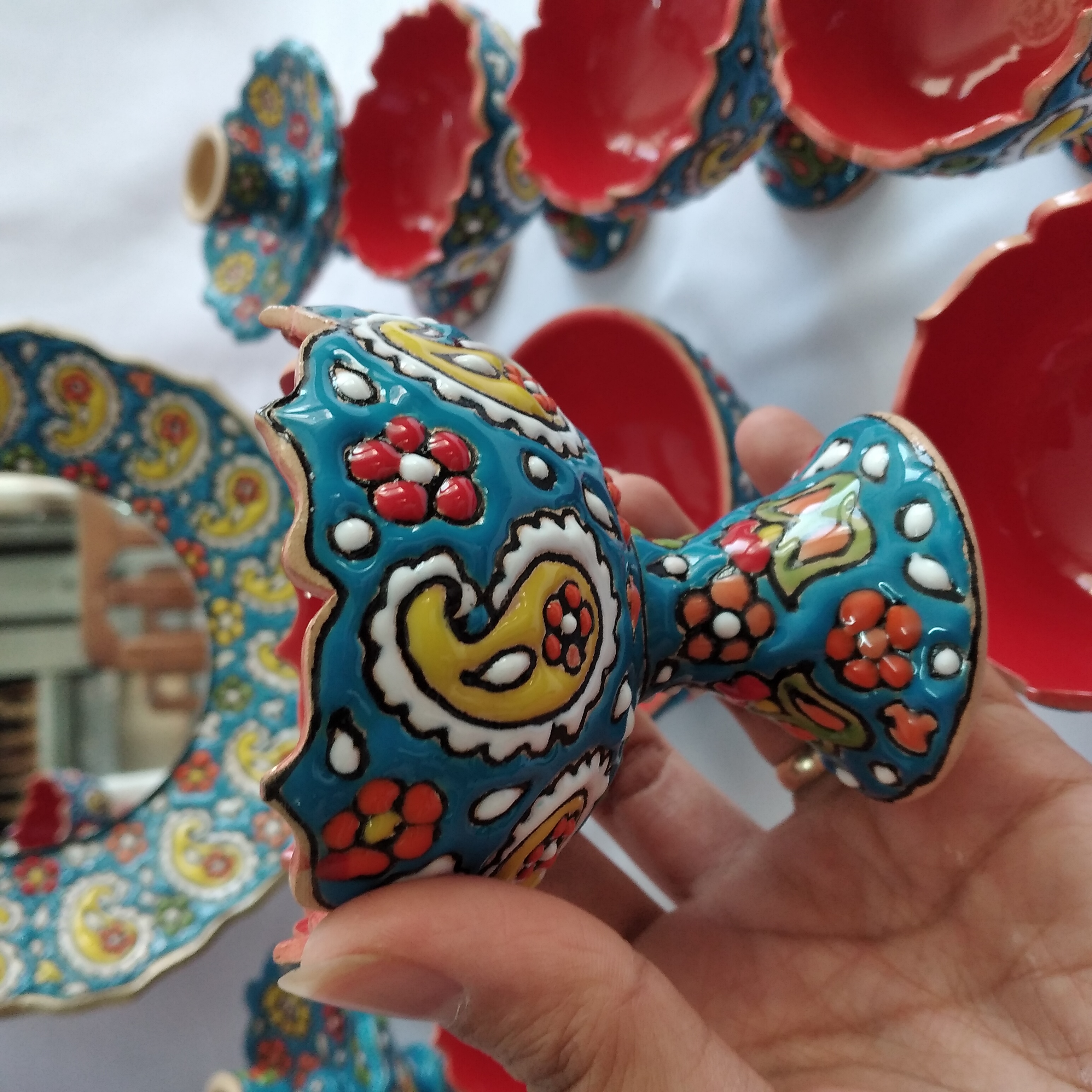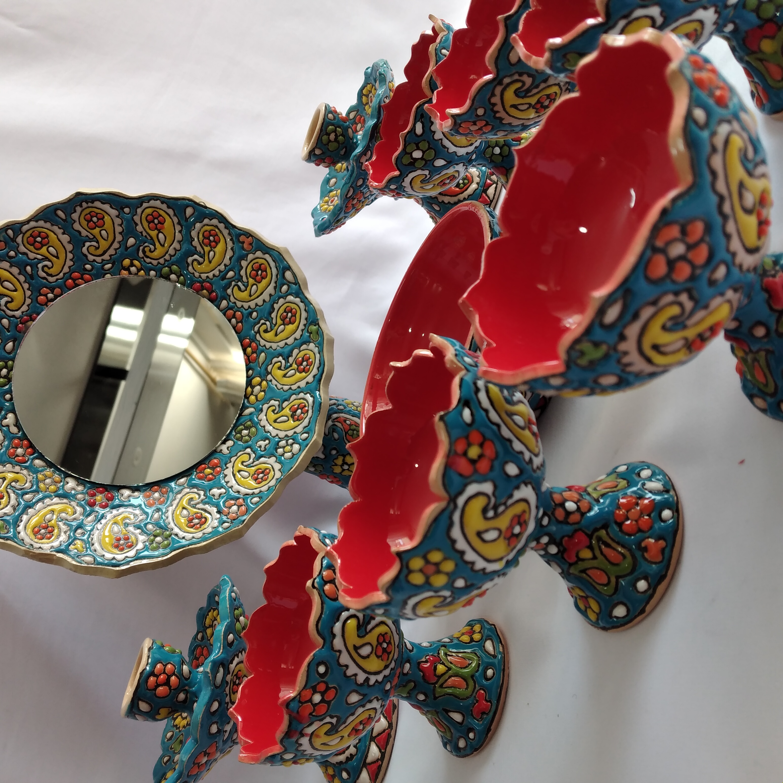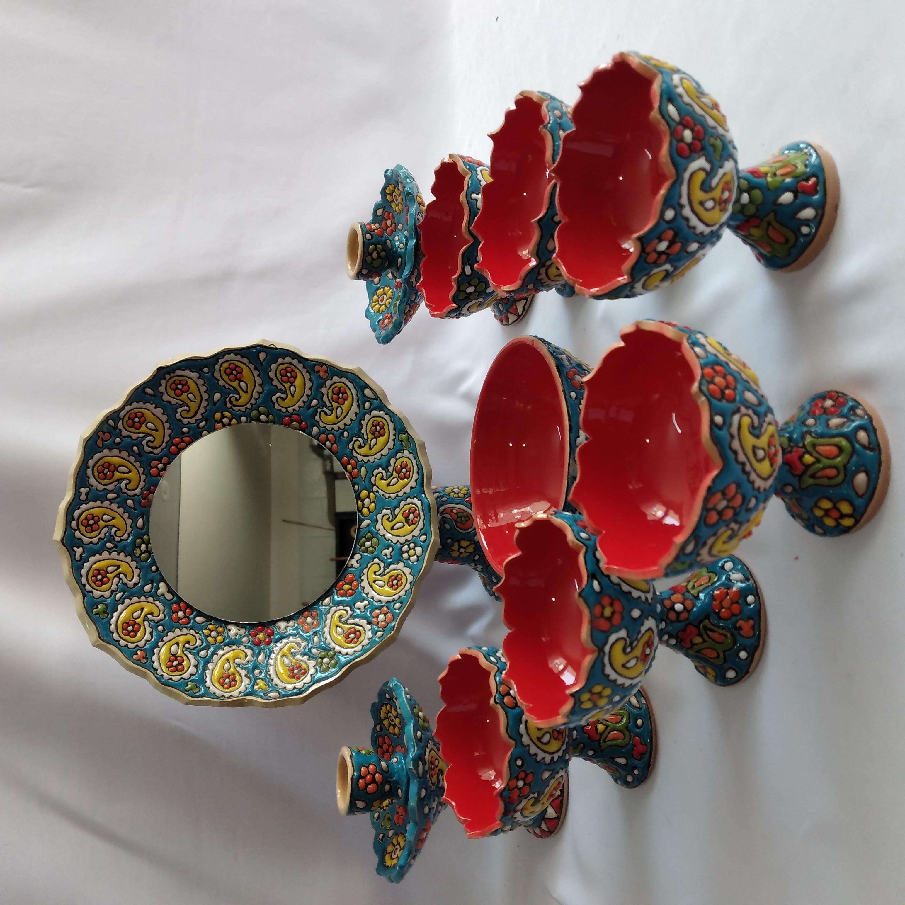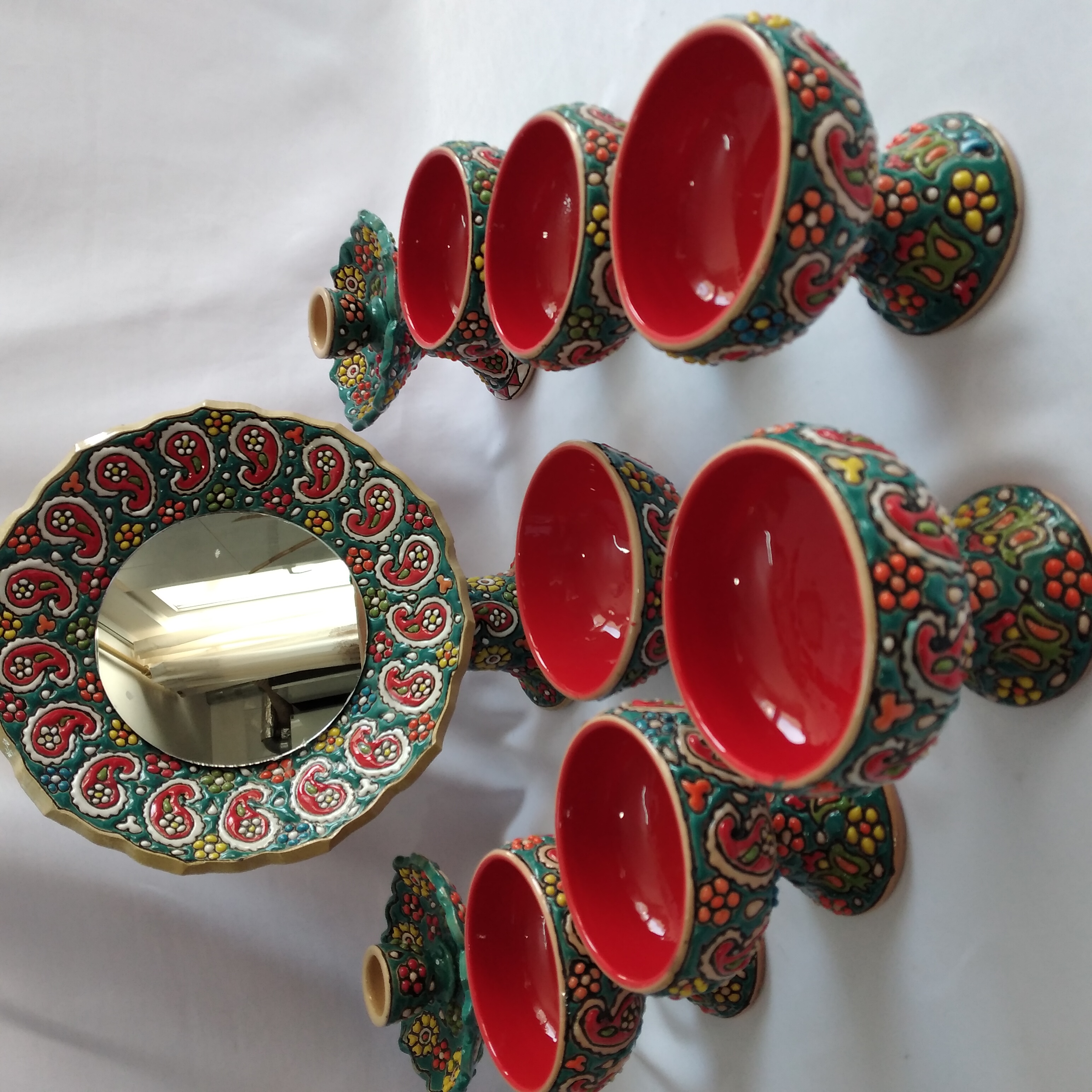 ست ۱۰ تیکه هفت سین میناکاری شده شامل ۶ عدد جام ۲ عدد جاشمعی یک عدد آینه و ظرف سبزه