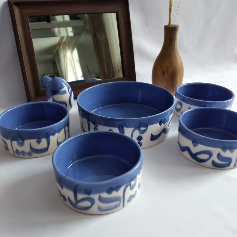 ست هفت سین کالیگرافی آبی شامل یک عدد ظرف سبزه با دهانه 16 سانت و 4 عدد پیاله با دهانه 10 سانت یک عدد تخم مرغ و یک عدد آینه 19*25 تماما کار دست و مستقیم از تولیدی با تخفیف 10 درصد تقدیمتون میشه .