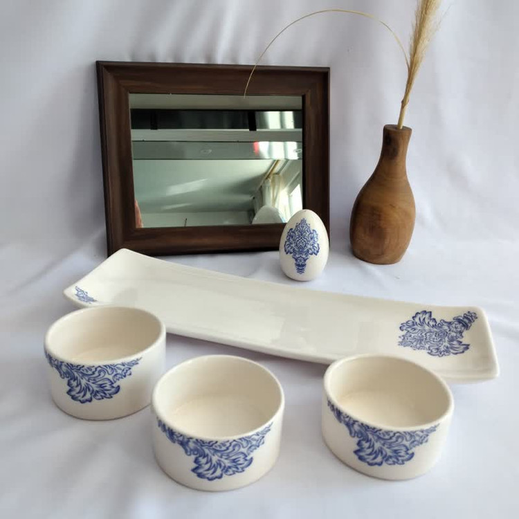ست زیبای قلم آبی که به عنوان هفت سین طراحی و اجرا شده شامل 3 عدد پیاله با دهانه 7 سانت یک عدد رولت خوری و یک عدد تخم مرغ و آینه است .این ست بعد از استفاده به عنوان هفت سین به دلیل مصرفی بودن و قابل شست و شو بودن ظروف میتوانید در آشپزخانه به عنوان ظرف اردو خوری - ترشی خوری- ماست خوری یا برای سرو هر چیز دیگر مورد استفاده قرار دهید .
