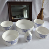 ست زیبای قلم آبی که به عنوان هفت سین طراحی و اجرا شده شامل4عدد کاسه با دهانه10سانت یک عددکاسه با دهانه15 سانت و یک عدد تخم مرغ و آینه است .این ست بعد از استفاده به عنوان هفت سین به دلیل مصرفی بودن و قابل شست و شو بودن ظروف میتوانید در آشپزخانه به عنوان سرو مواد غذایی مورد استفاده قرار دهید .